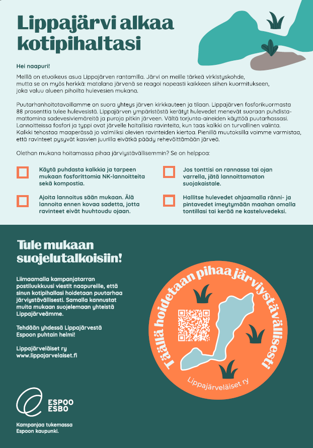 Lippajärveläiset ry toteuttaa kampanjan Lippajärven veden laadun parantamiseksi. Hulevesien mukana tulevat ravinteet heikentävät järven veden laatua ja lisäävät sinileväriskiä. Yhdistys on painattanut 2000 asiasta kertovaa esitettä, jotka jaetaan Lippajärven hulevesialueella sijaitseviin pihallisiin kiinteistöihin. Esitteessä on ohjeita järvisystävälliseen puutarhanhoitoon sekä tarra, jonka voi liimata postilaatikkoonsa. Näin voi tukea kampanjaa ja kertoa itse vaalivansa Lippajärven kuntoa. Tarra irtoaa tarvittaessa postilaatikosta jälkiä jättämättä.